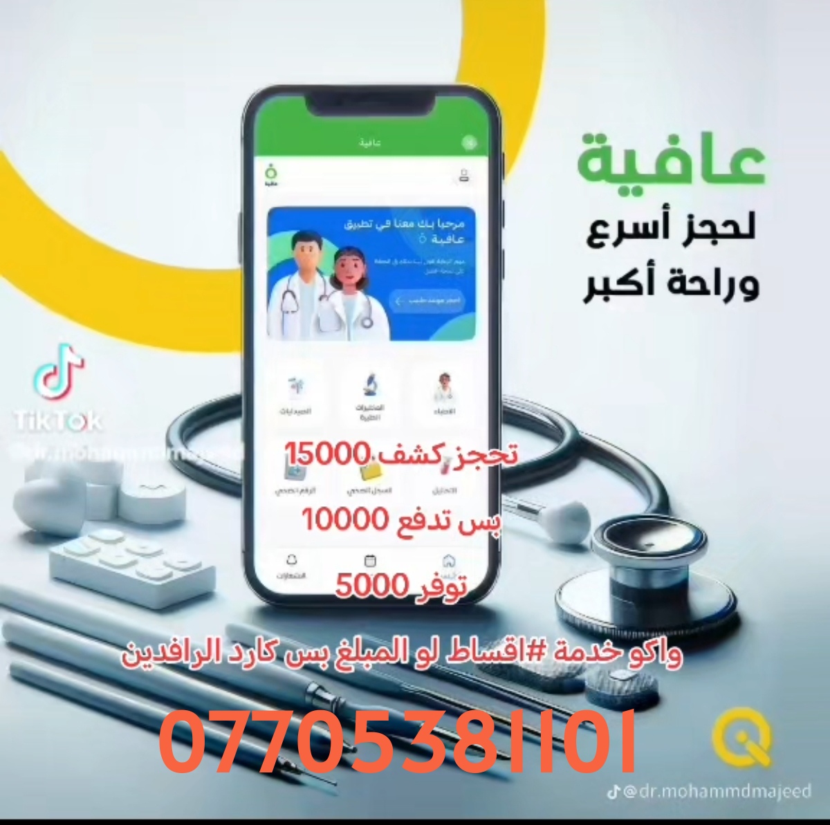 طرق الدفع ممكن كاش بالعيادة، وممكن عن طريق سوبر كي تطبيق عافية من كي